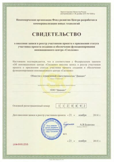 21.11.2014 Свидетельство о присвоении статуса участника Сколково