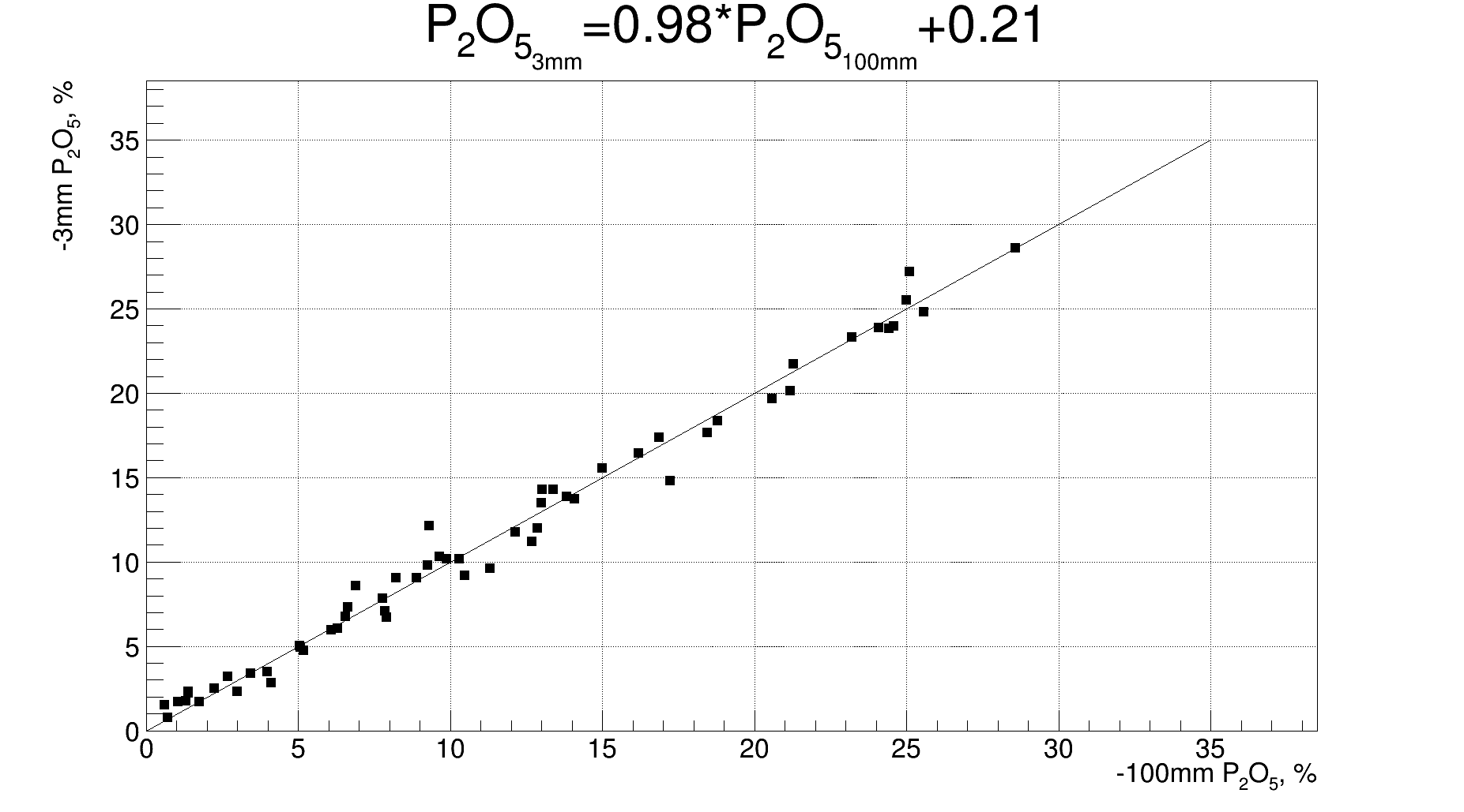 Измерения 58 проб с крупностью -100 мм позволили определить переходную характеристику, связывающую значения параметра АГП для проб с крупностью -100 мм и крупностью -3 мм.