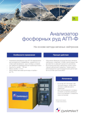 - Анализатор фосфорных руд АГП-Ф предназначен для экспрессного определения элементного состава проб фосфорных руд в полевых условиях.